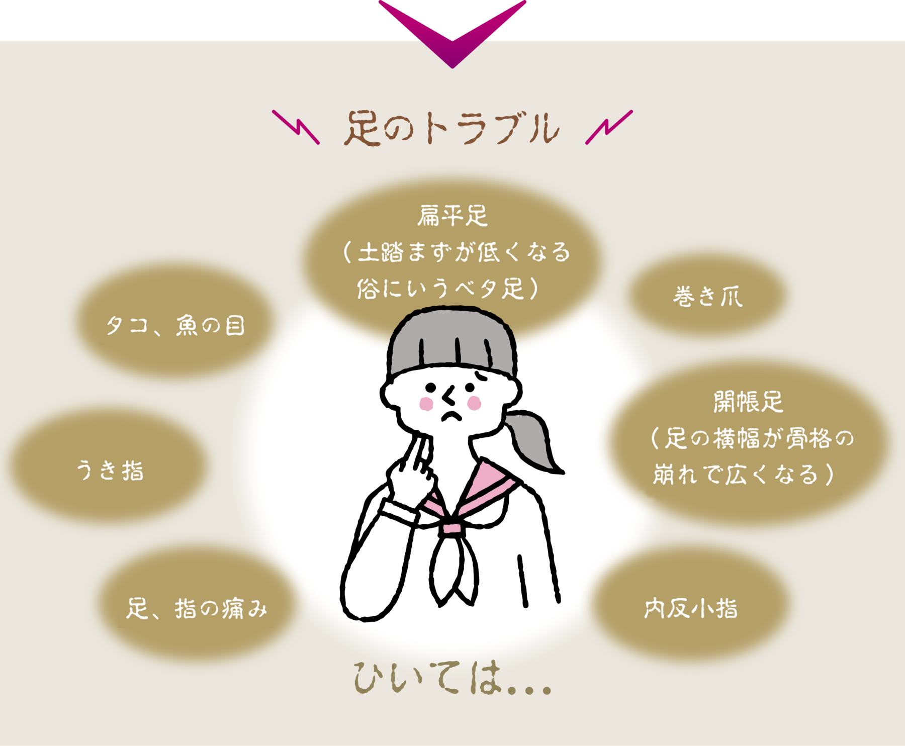 靴のつま先には、様々な形状があります。つま先が細い靴を長期間履いていると、外反母趾や内反小趾(ないはんしょうし)などの変形、足の指の痛みを引き起こします。